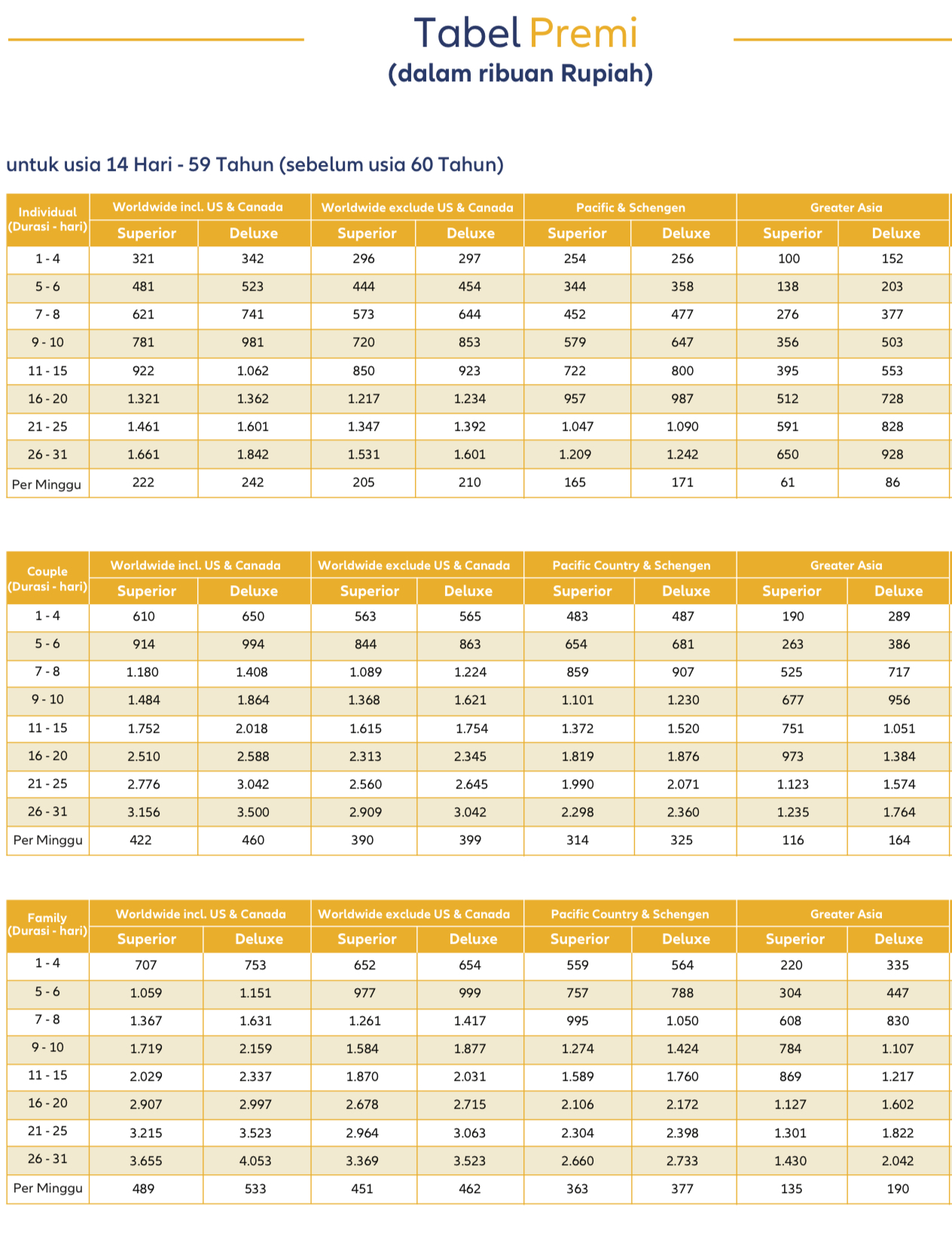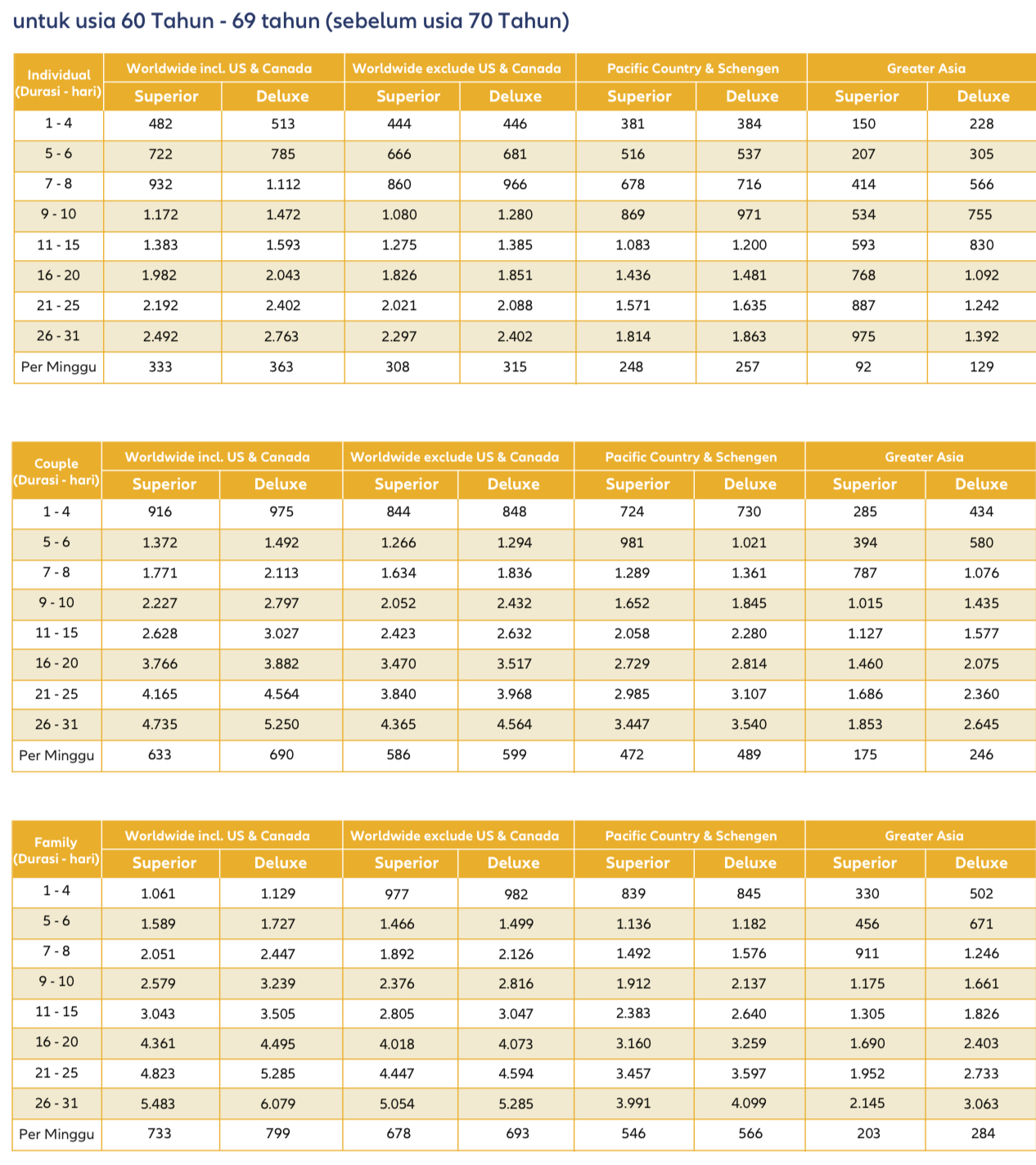 Tabel Premi Asuransi Perjalanan Allianz New TravelPRO